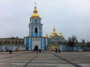 | Když vyjdete z kláštera ven, máte před sebou (kromě všudypřítomného Bohdana Chmelnického) Vladimírský prospekt a na jeho konci klášter a chrám svatého Michala. |